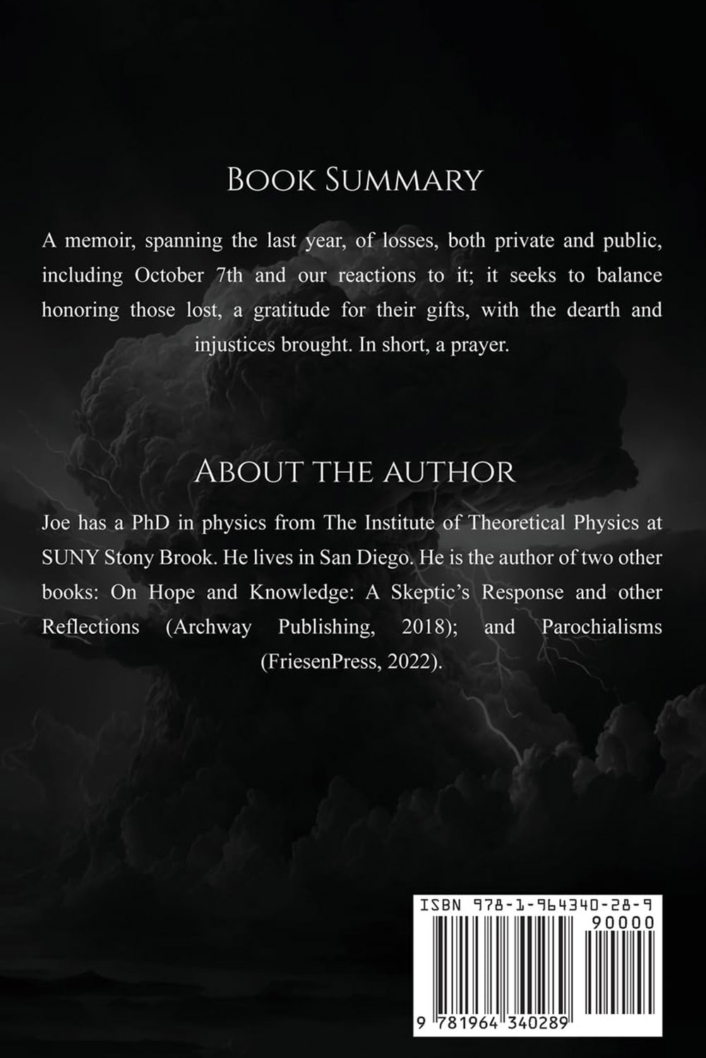 A memoir, spanning the last year, of losses, both private and public, including October 7th and our reactions to it; it seeks to balance honoring those lost, a gratitude for their gifts, with the dearth and injustices brought. In short, a prayer.