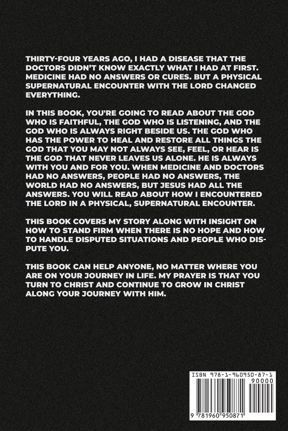 In this book, you’re going to read about the God who is faithful, the God who is listening, and the God who is always right beside us. The God who has the power to heal and restore all things. The God that you may not always see, feel or hear is the God that never leaves us alone. He is always with you and for you. When medicine and doctors had no answers, people had no answers, the world had no answers, But Jesus had all the answers. You will read about how I encountered the Lord in a physical, supernatural encounter.
