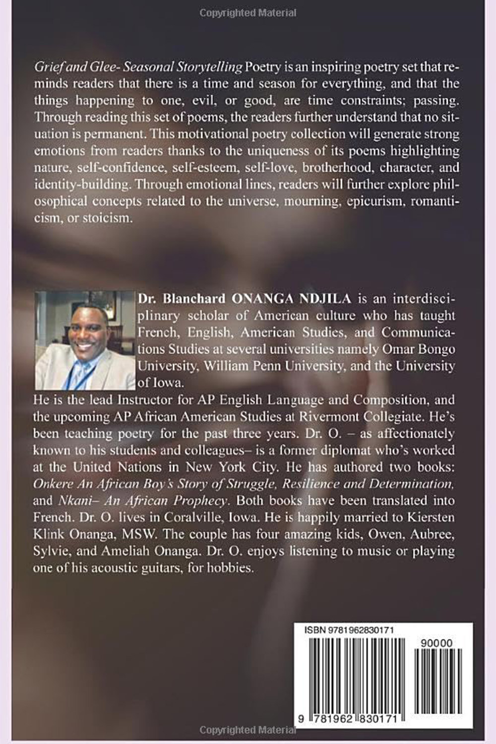 Grief and Glee- Seasonal Storytelling Poetry is an inspiring poetry set that reminds readers that there is a time and season for everything, and that the things happening to one, evil, or good, are time constraints; passing. Through reading this set of poems, the readers further understand that no situation is permanent. This motivational poetry collection will generate strong emotions from readers thanks to the uniqueness of its poems highlighting nature, self-confidence, self-esteem, self-love, brotherhood, character, and identity-building. Through emotional lines, readers will further explore philosophical concepts related to the universe, mourning, epicurism, romanticism, or stoicism.