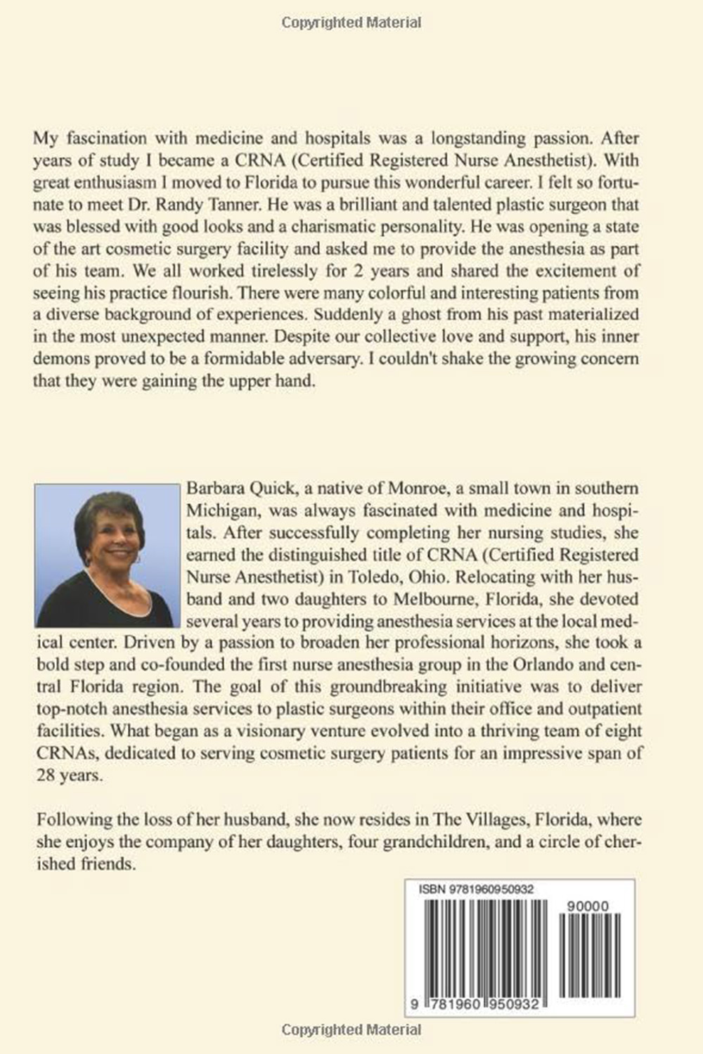 A nurse anesthetist works for a charismatic very successful plastic surgeon. There are many scenarios involving cosmetic surgery patients. All are true and were my patients. The surgeon’s past comes back to haunt him and he travels down a dark road to self-destruction.